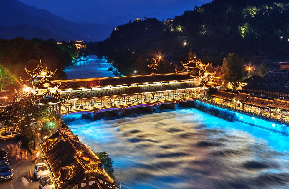 之后来到战国秦昭王时期(公元前 227 年)蜀郡守李冰在岷江上修建的中华第一古堰——被列为“世界文化遗产”的都江堰水利工程:宝瓶口引水口、飞沙堰泄洪坝、观鱼嘴分水堤。过安澜索桥,隔着岷江内江观看在 512 地震中被损坏的秦堰楼、纪念李冰父子的二王庙,途经茶马古道可观看都江堰与二王庙在历史变迁中的照片。可乘坐大扶梯(自费 40 元/人)参观都江堰全景。参观完后前往青城山山下农家乐(约12点左右),享用特色中餐。