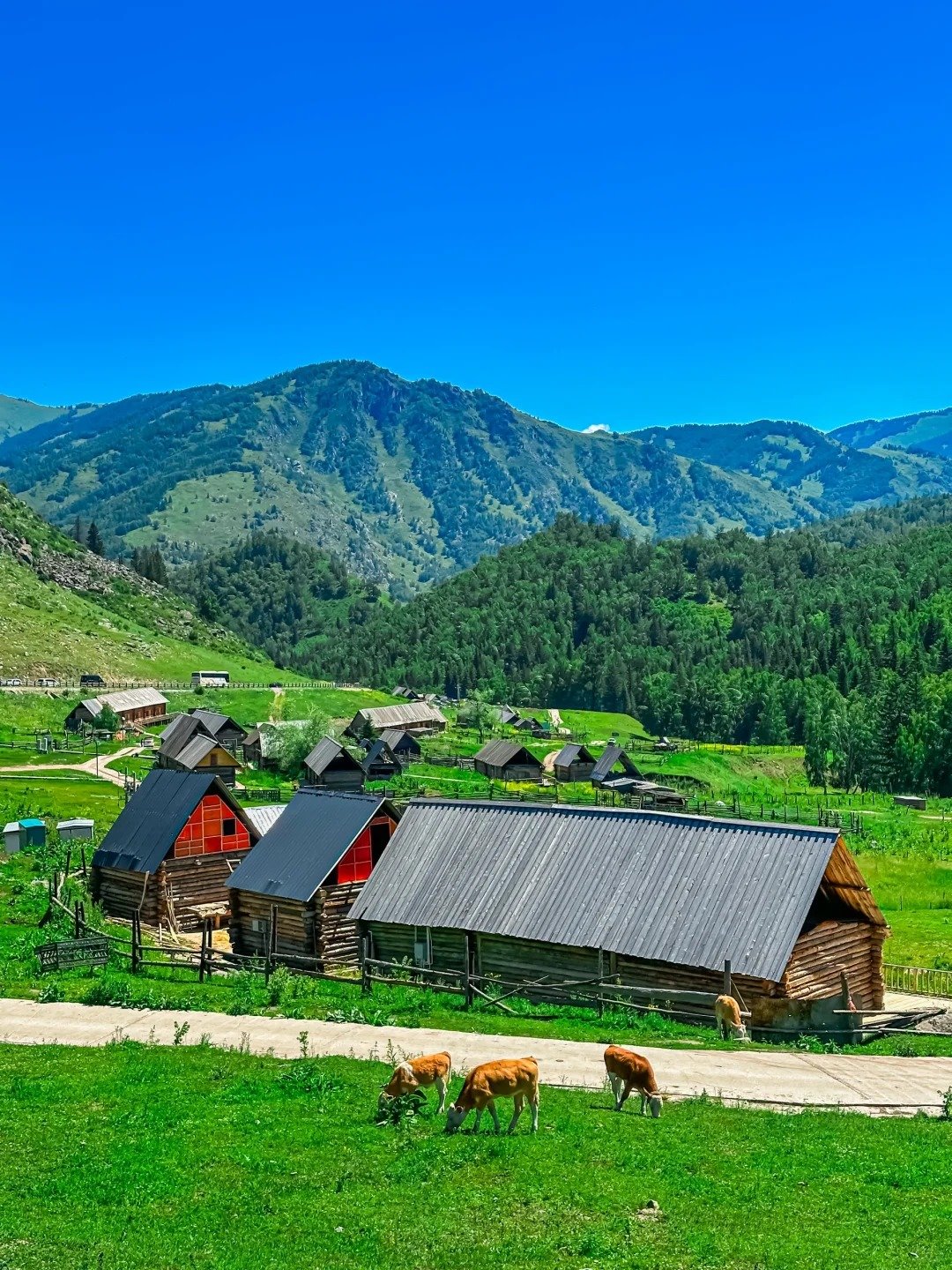 驰骋阿禾公路,途观乌希里克牧场: 阿禾公路是串联阿勒泰与禾木的绝美景观走廊。车行其中,犹如在Windows桌面中穿行。首先映入眼帘的是 乌希里克牧场 ,这里水草丰美,牛羊如珍珠般散落在连绵的草坡上,木屋炊烟袅袅,一派宁静的牧歌景象。