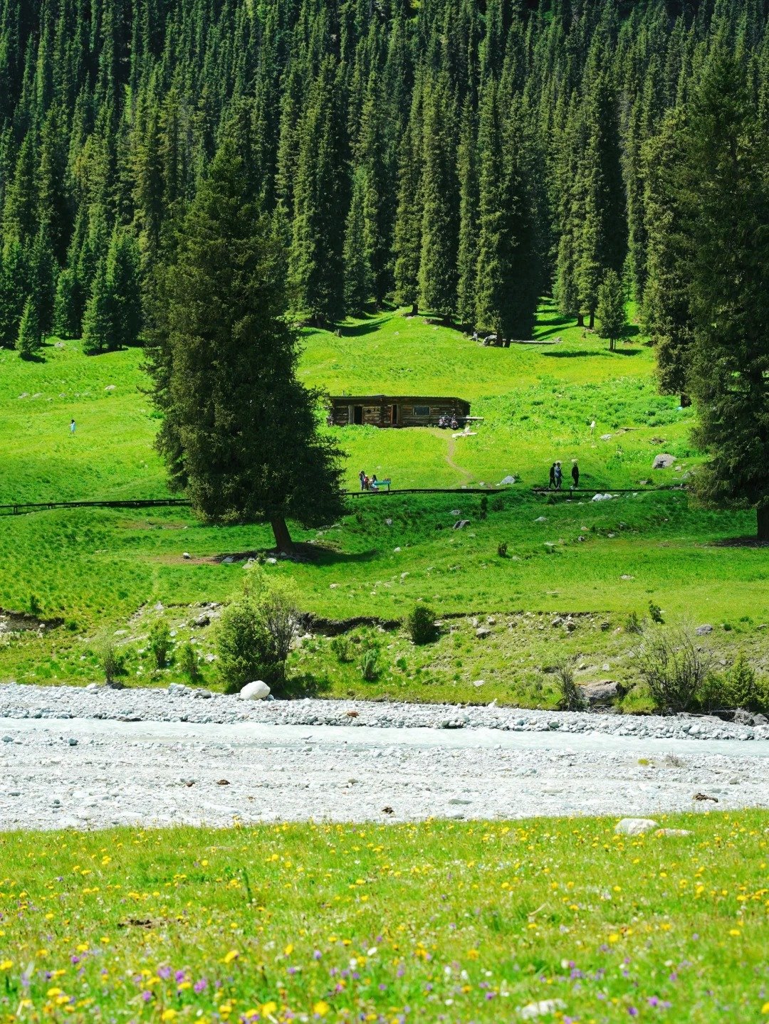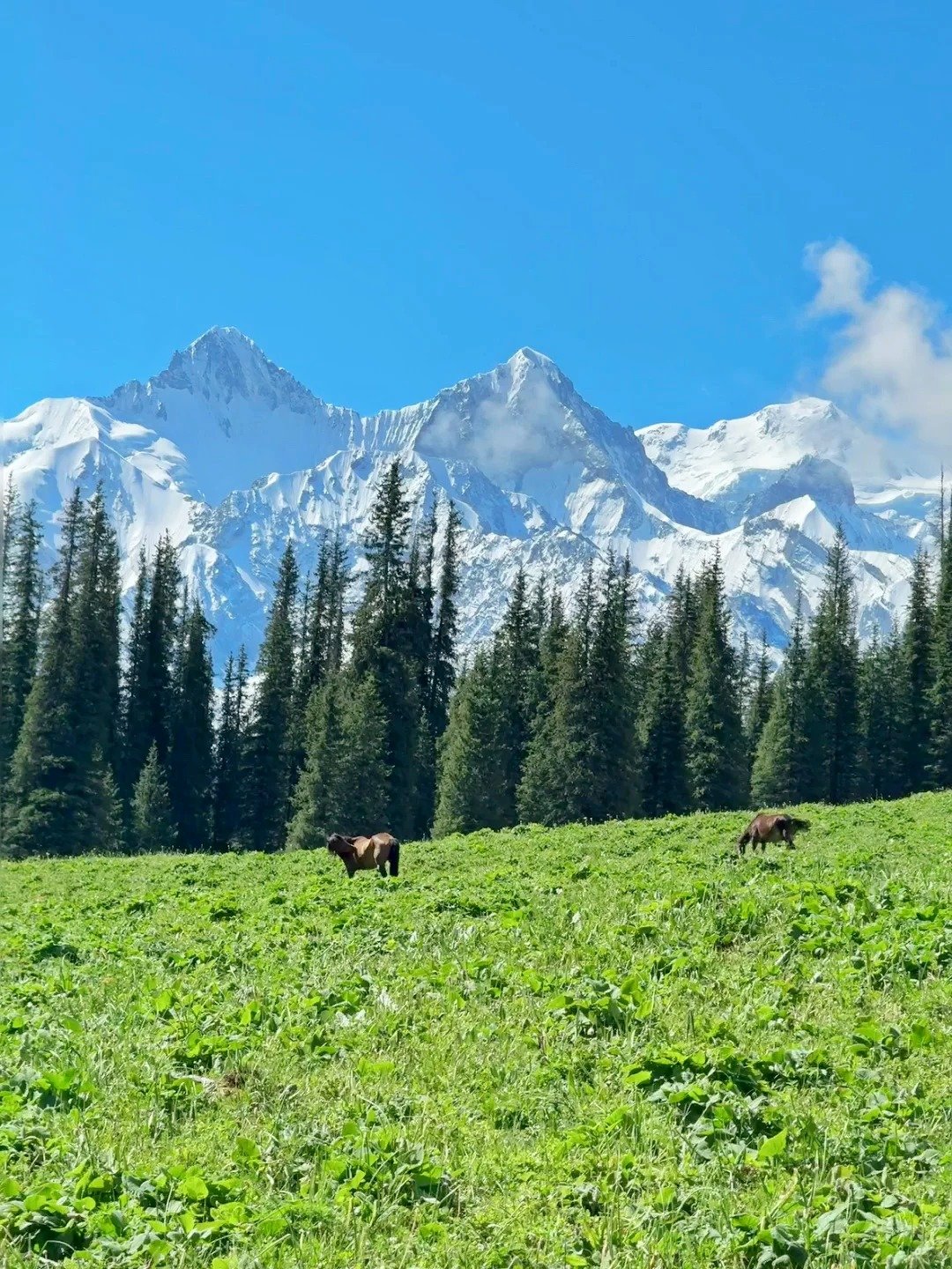 沉醉托勒海特大草原: 穿过森林,豁然开朗,抵达 托勒海特大草原 。这里地势开阔平坦,草甸如巨大的绿色绒毯铺向天际线,与远方的雪山和蓝天白云构成一幅层次分明的壮阔画卷。在此自由停留,漫步、奔跑、尽情拍摄,感受天地之辽阔。