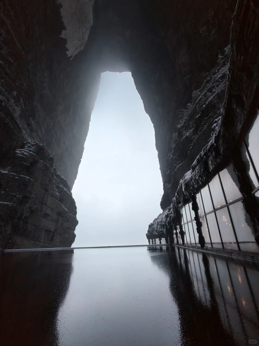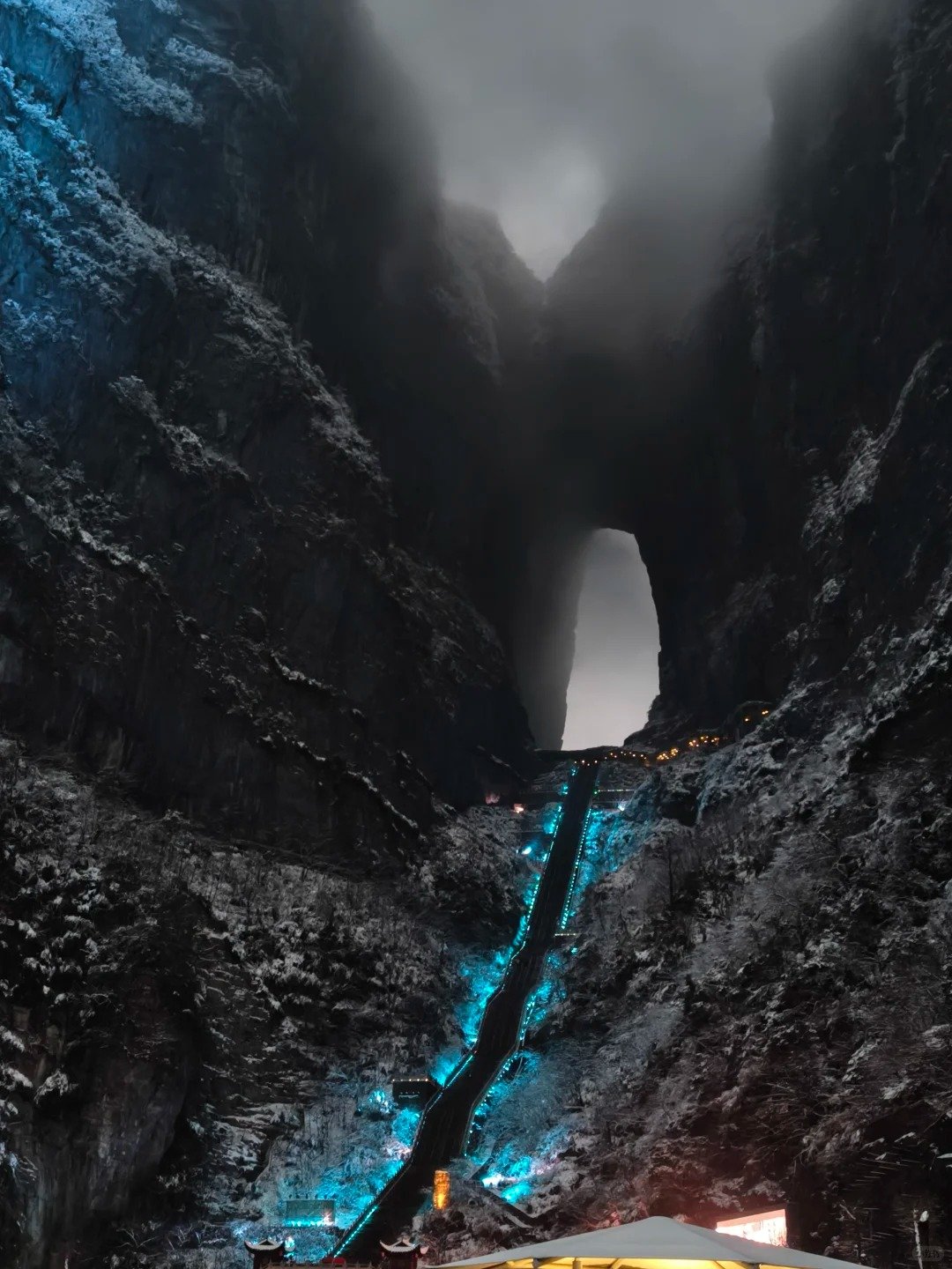 3:天门洞开:九百九十九级台阶登上天门洞,登天祈福。高131.5米,宽50余米,南北对开于千寻素壁之上,气势磅礴,巍峨高绝,是罕见的高海拔穿山溶洞,更是尽显造化神奇的冠世奇观,2006俄罗斯空军张家界天门山特技飞行表演让天门洞悬念升级,再次成为全球焦点。