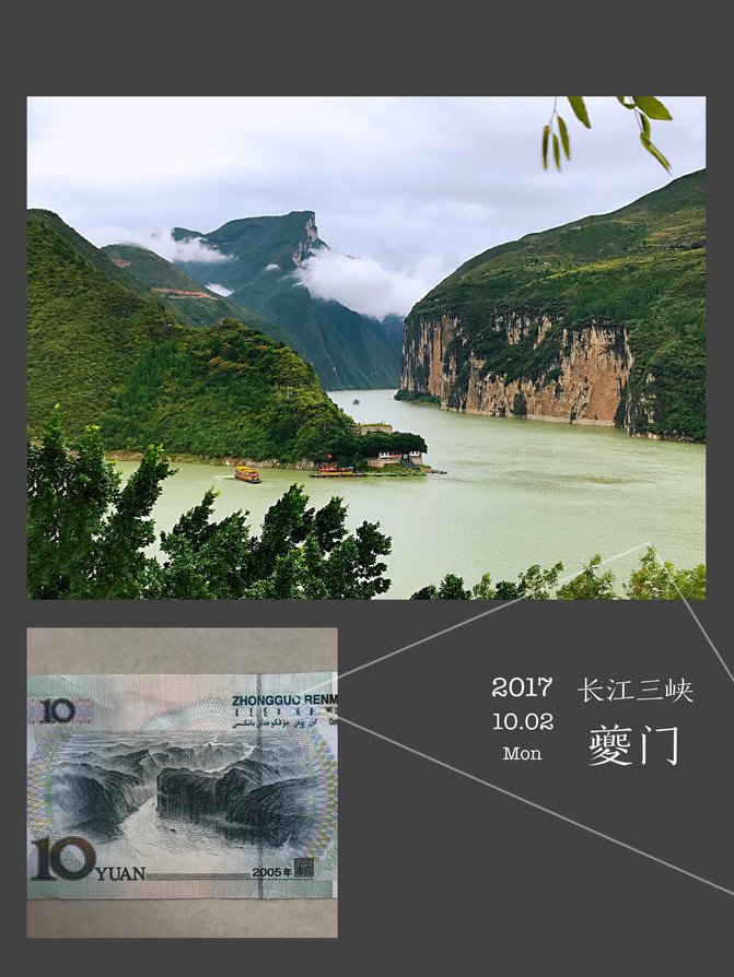 绝世惊艳夔门,和人民币上稍有些不一样,显然拍摄的角度不同,人民币应该是航拍,崇山峻岭,奔腾大江,更为壮观!
