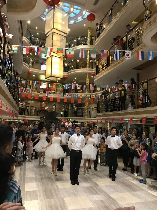 晚上还有“情醉三峡宾主同乐晚会”,今天的晚会还特地邀请了外国游客的表演,节目都很精彩。据说,邮轮的演员都是船上的工作人员,有厨师、服务员、船员等等,看来,没点才艺还不能在这儿工作了,哈哈。