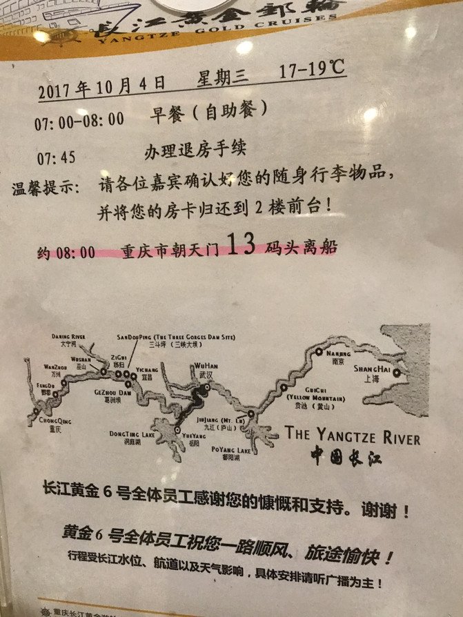 早晨,终于到达重庆啦!办理退房手续,下船啦。下船的时候会有一些挑夫来“帮”你拿行李,因为要上台阶,一开始我还以为是邮轮赠送的服务,后来看这架势才反应过来,是收费的,大叔们非常强硬,几乎是“抢”着帮你拿,所以如果你需要,可以;不需要,你的态度一定要明确,提醒大家注意啊。