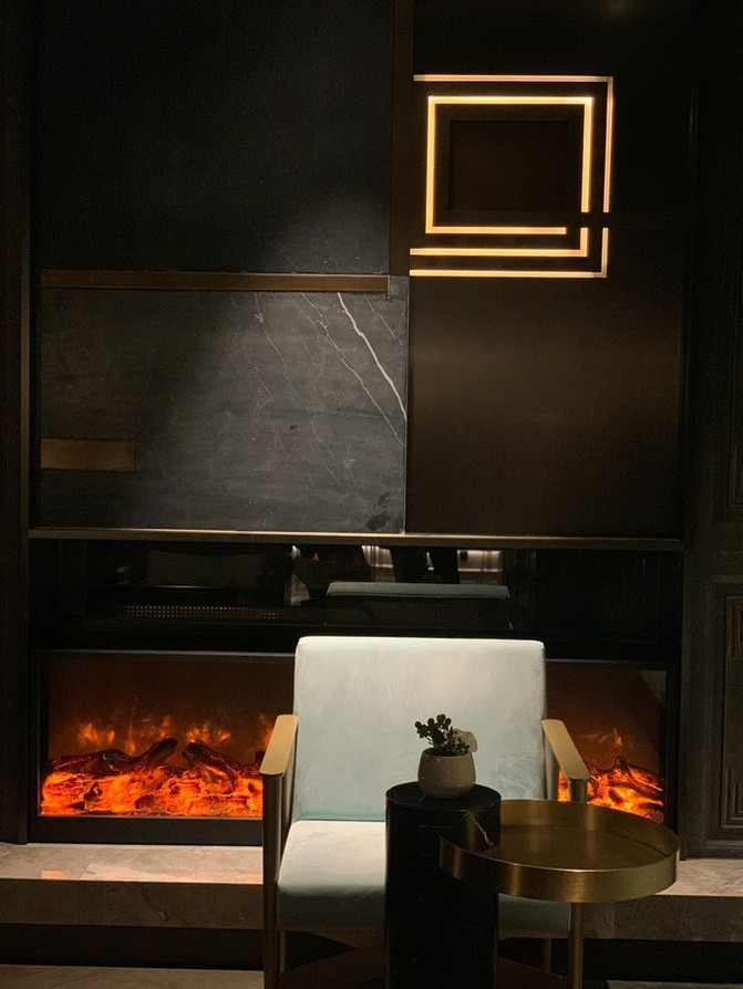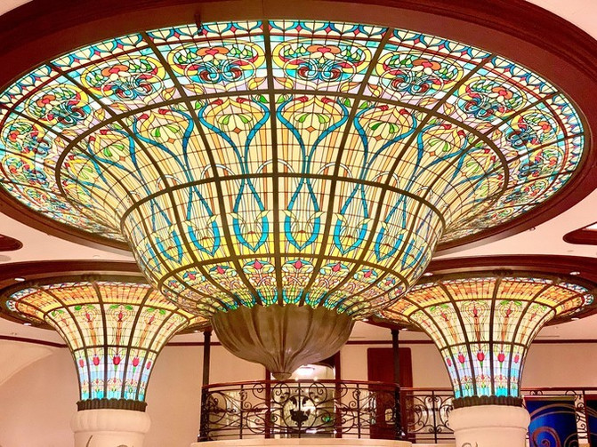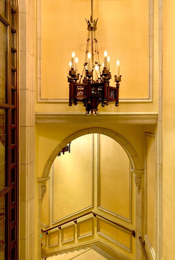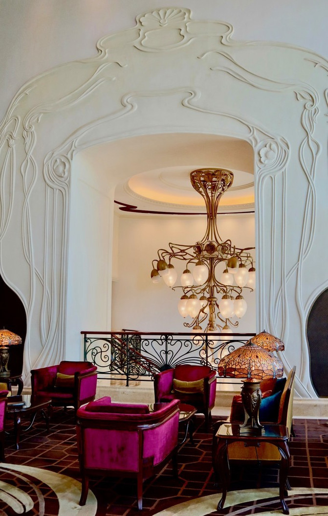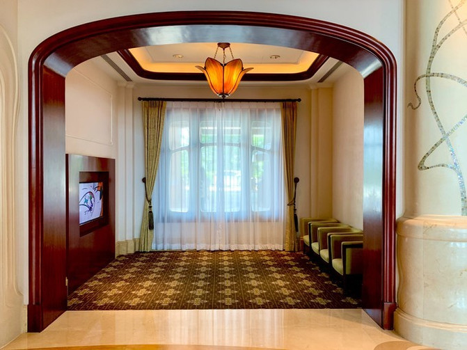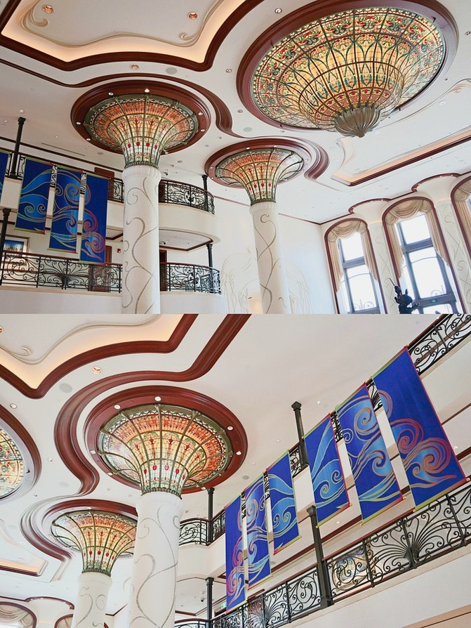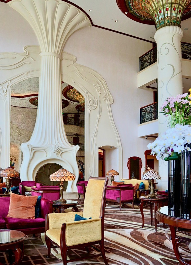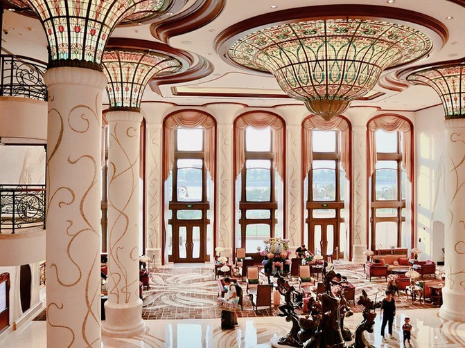 整个大堂挑高很高,复古,对称又古朴典雅,以“新艺术主义”为设计风格。
