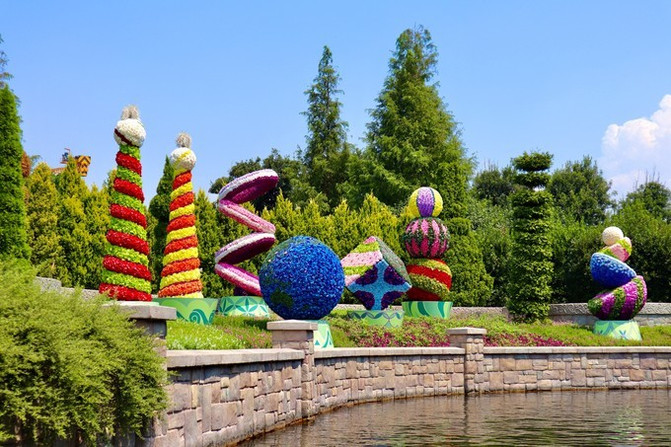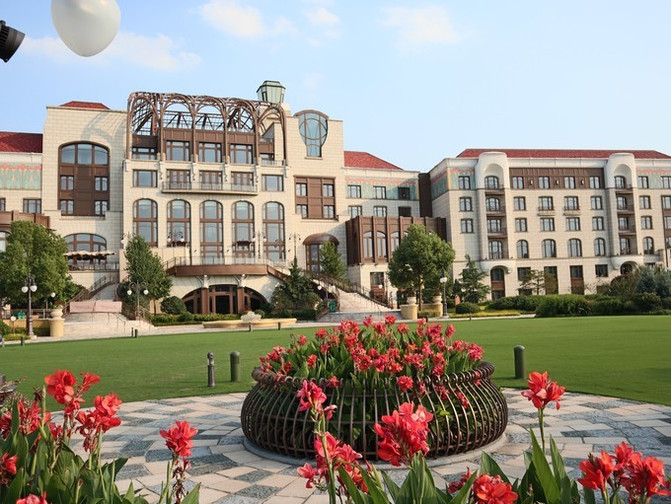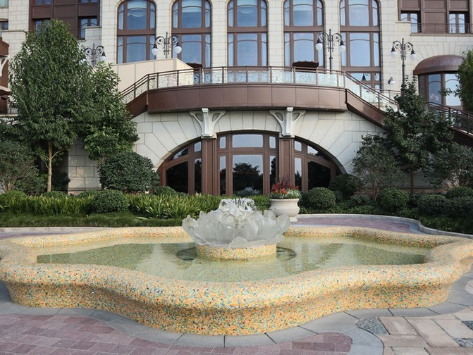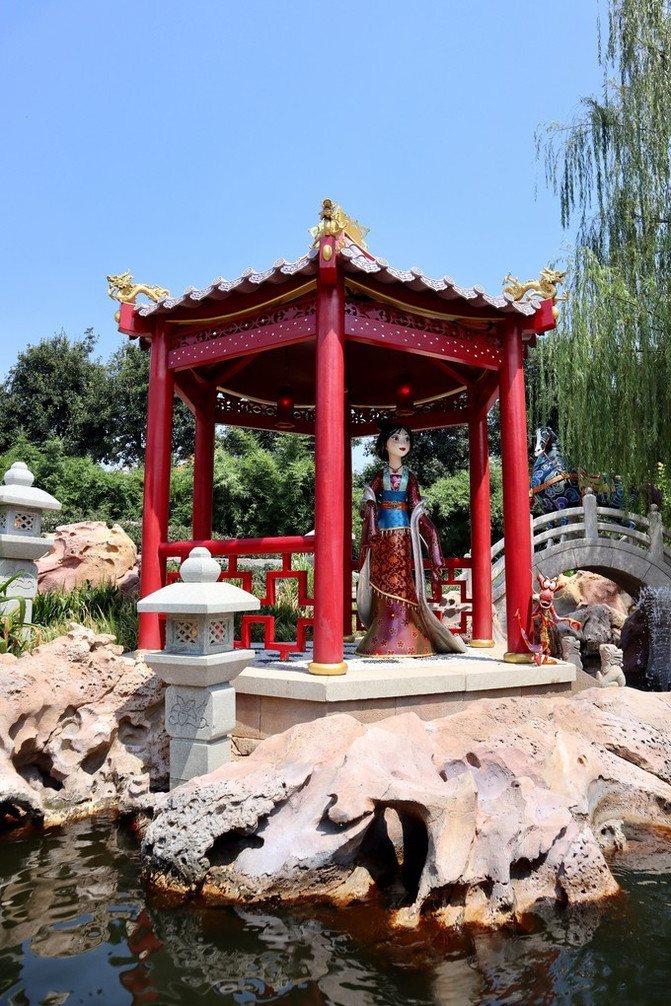 在酒店的喷泉中央,有一件别具中国特色的作品:独特的大型琉璃牡丹雕塑,雕塑周围环绕着经典迪士尼精灵们;这朵在上海制作的中国传统名花——牡丹,是中国最大的琉璃花卉雕塑之一。