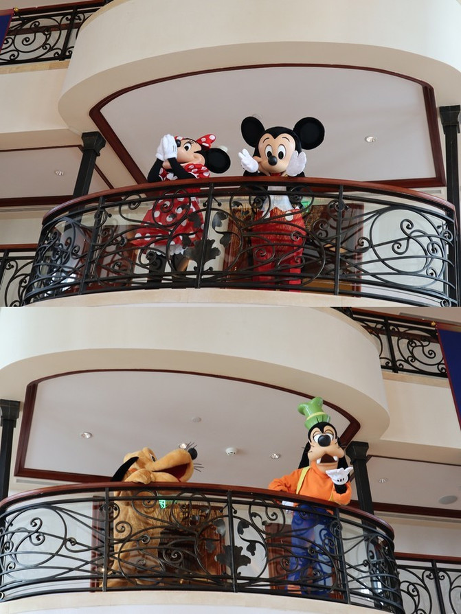 这是我妹超期待的环节,大堂交响乐刚一响,我还没反应过来,我妹就从沙发上蹭一下就起来跑到大堂中央等待着二楼的米奇,唐老鸭,高飞跟我们挥手欢迎。