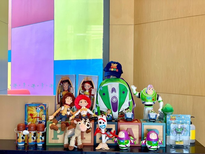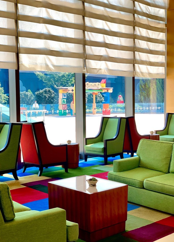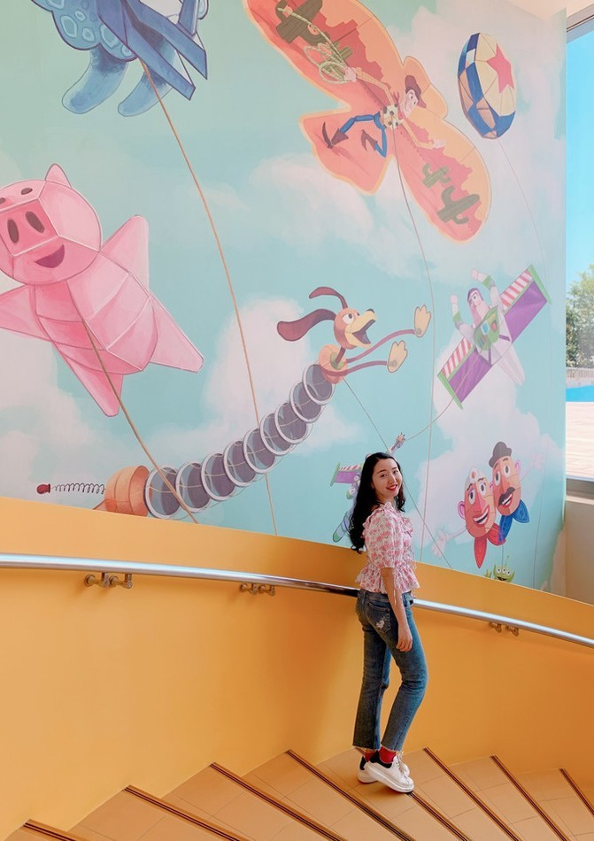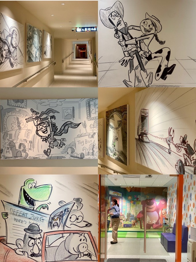 负一楼设有儿童游乐屋,可以把自家孩子“寄存”在这里让工作人员帮忙照顾游玩,整个过道也全是《玩具总动员》手绘版墙画。父母也可以带着孩子们前往酒店内的家庭活动中心,参与各种以迪士尼·皮克斯为特色的互动活动、手工制作、儿童游戏以及讲故事时间。