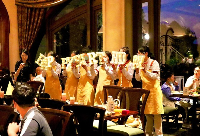 若是遇到了小朋友过生,服务员会拿着发光的birthday 字母来到小朋友面前唱生日歌,很开心的样子。