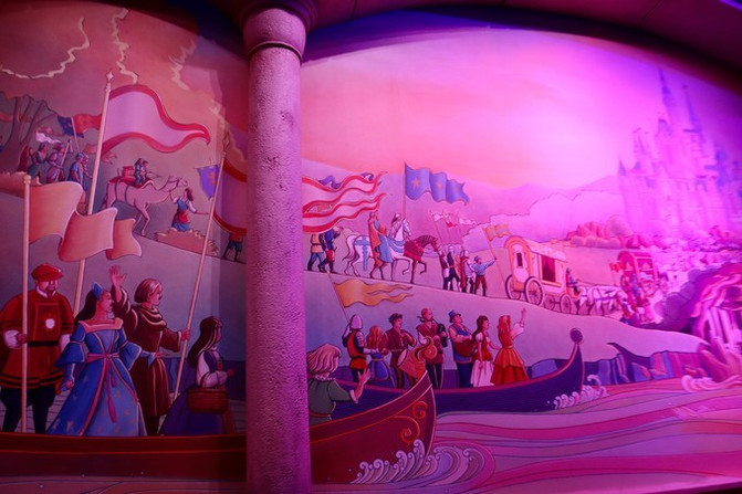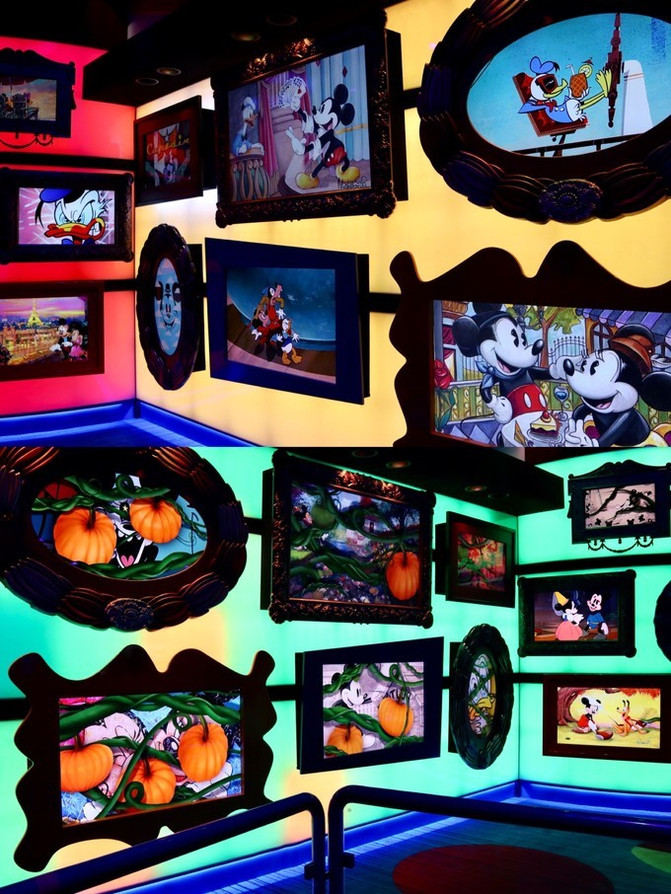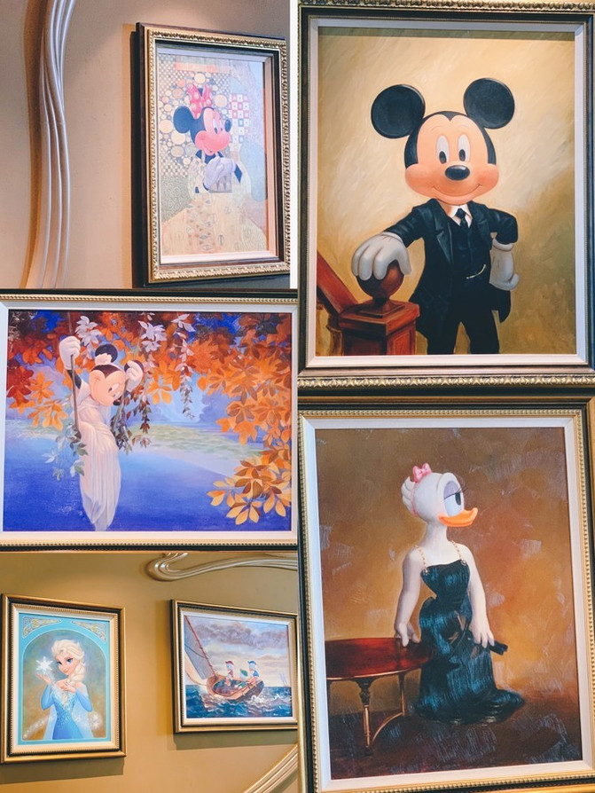 左右两个前台,后面墙上全是迪士尼乐园卡通明星照片墙,每一副都不一样,模仿世界名画的构图,模拟重组世界名画,但是主人翁全都是迪士尼卡通明星们!可爱惨了。