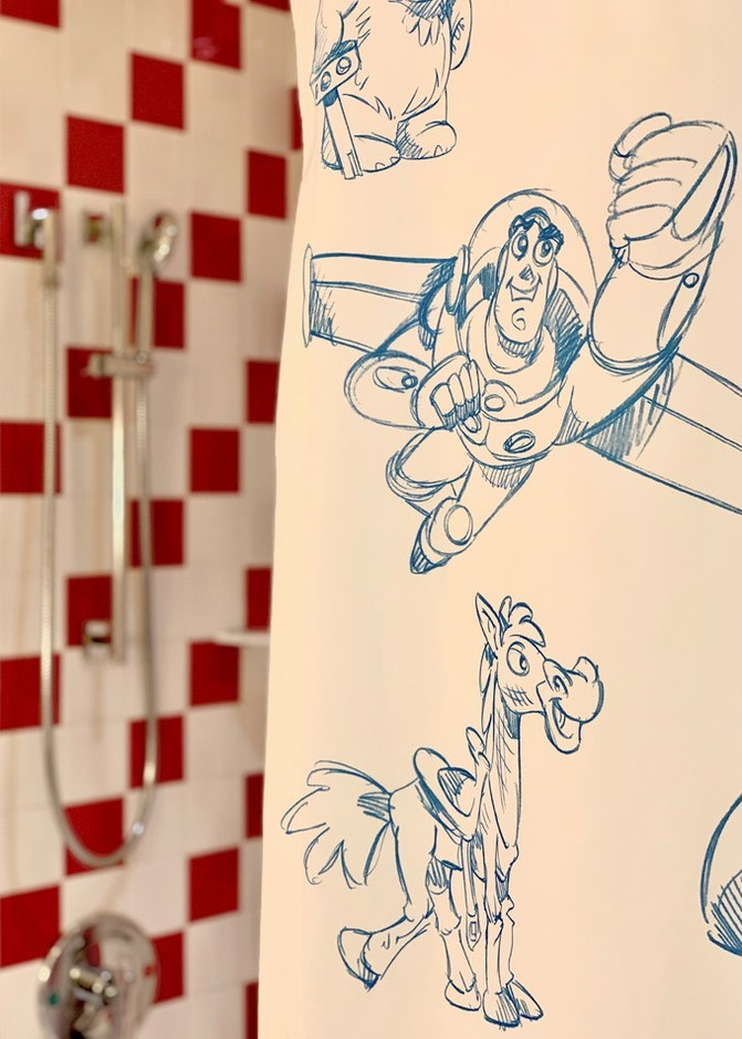 连浴缸的挂帘都是卡通形象,墙壁红白瓷钻相间,可可爱爱的。