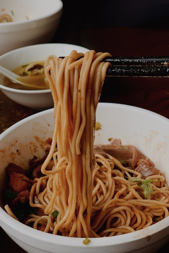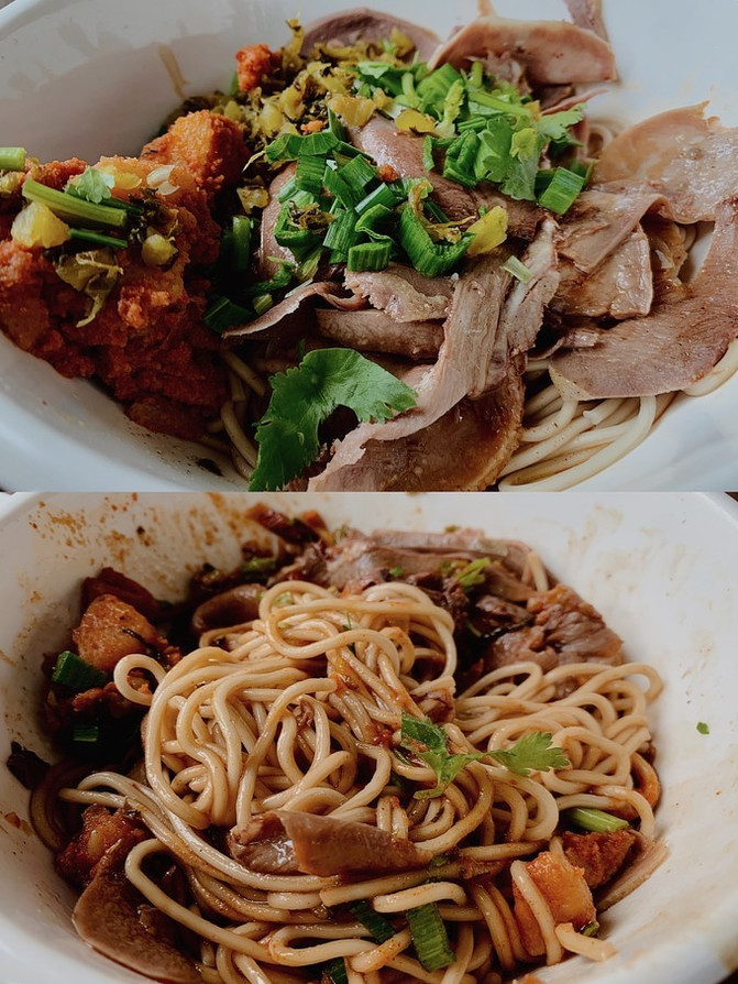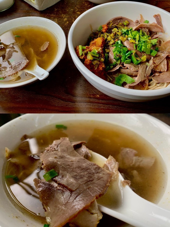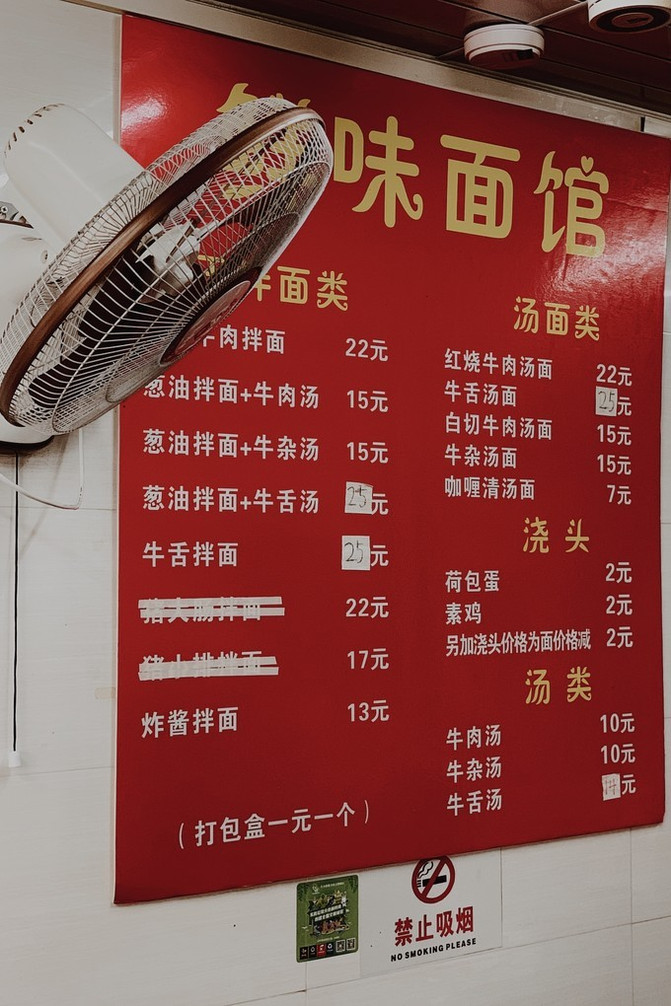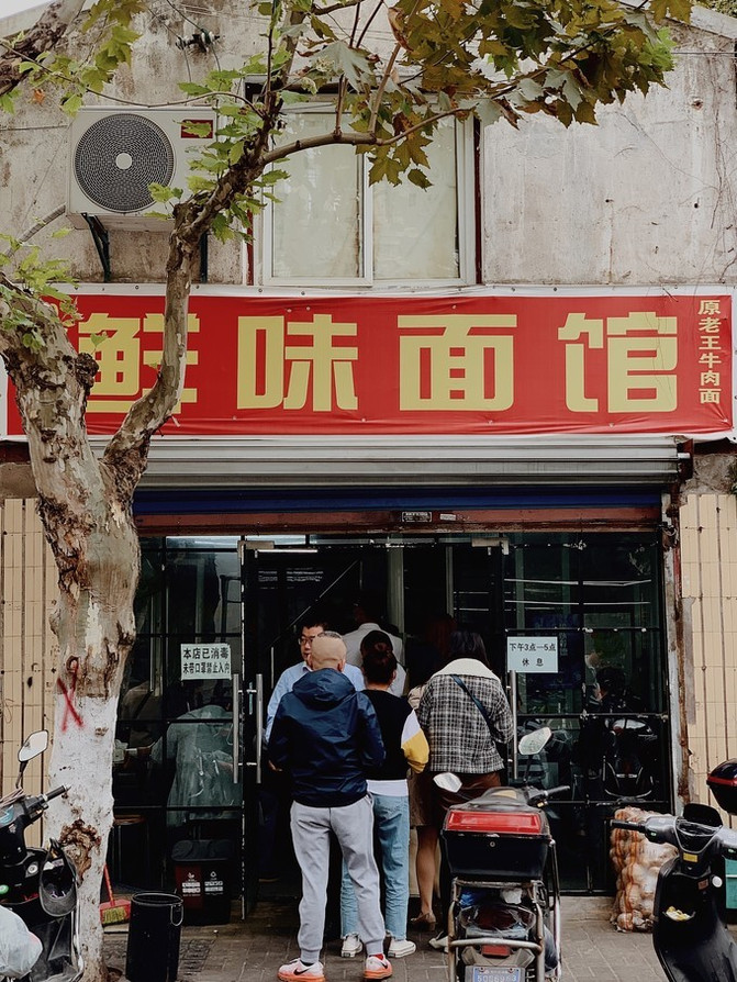 在上海的老街道里,一栋2层楼独栋老屋,还未走近,就看见不少人排队。原来是先在一楼的窗口排队买单,领面,然后再找座位坐下。一,二楼均可坐。我赶紧迅速查了一下攻略,立马在快轮到我扫码点单时做好决定:牛舌拌面+牛肉汤=35元。窗口里师傅们忙碌着煮面,切牛舌,舀配料...