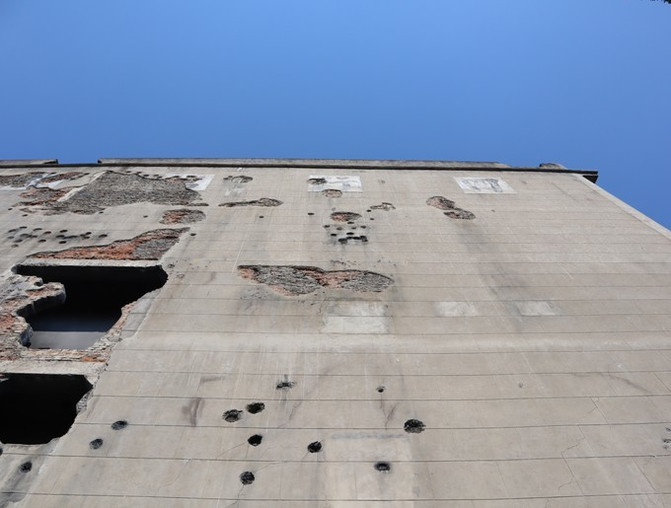 朝西的一面墙还原了战斗留下的弹孔、炮洞,露出红砖墙斑驳陈旧的样子,是城市中难得还原历史样貌的所在。