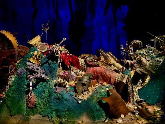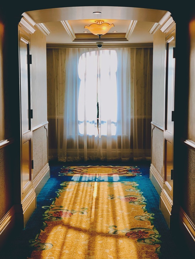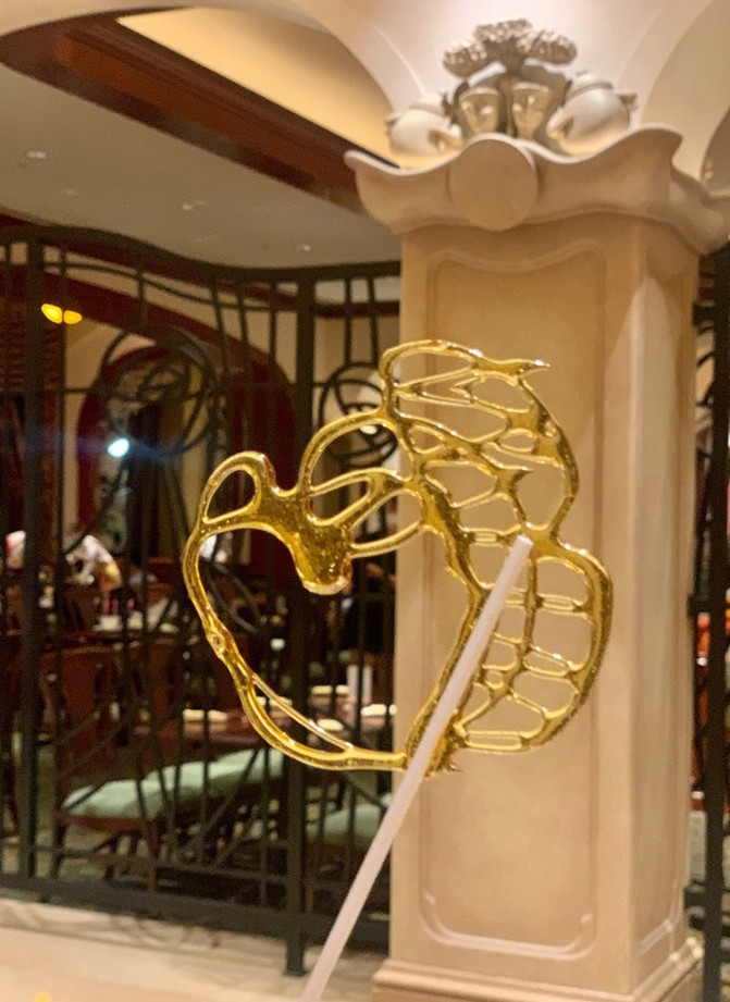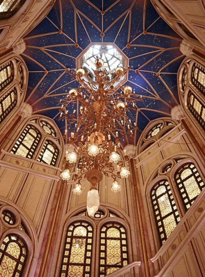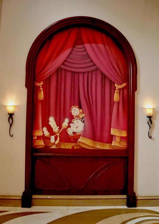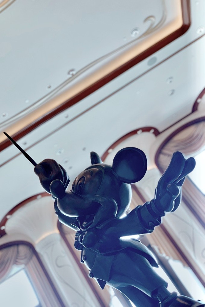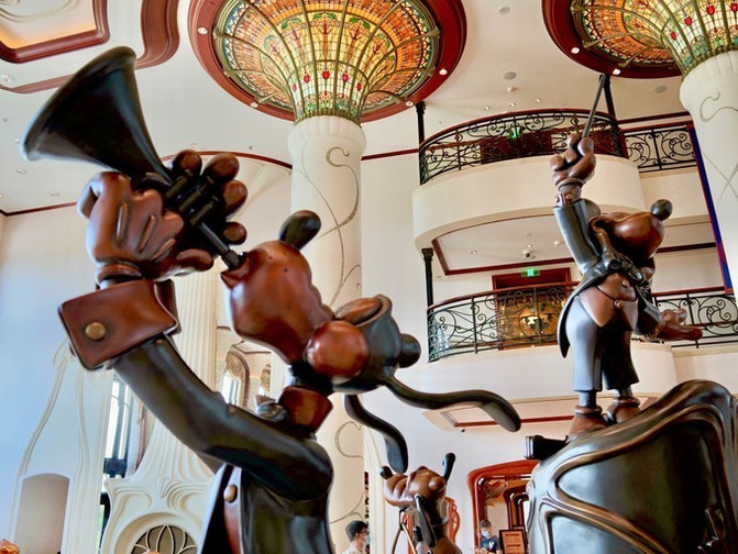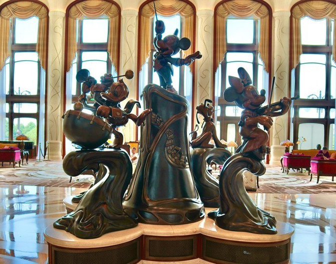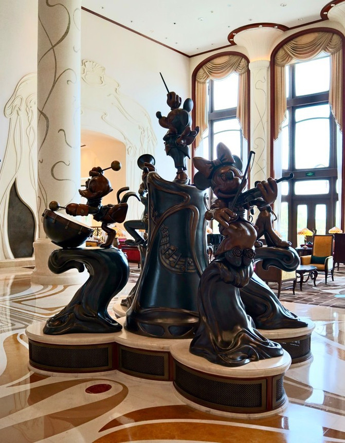 酒店大堂讲究对称,中间标志性雕塑是迪士尼的卡通巨星-米老鼠和他的朋友们。整个雕塑我认为是致敬米老鼠的《米奇幻想曲》,演奏音乐的他们是给我们造梦的第一要素。