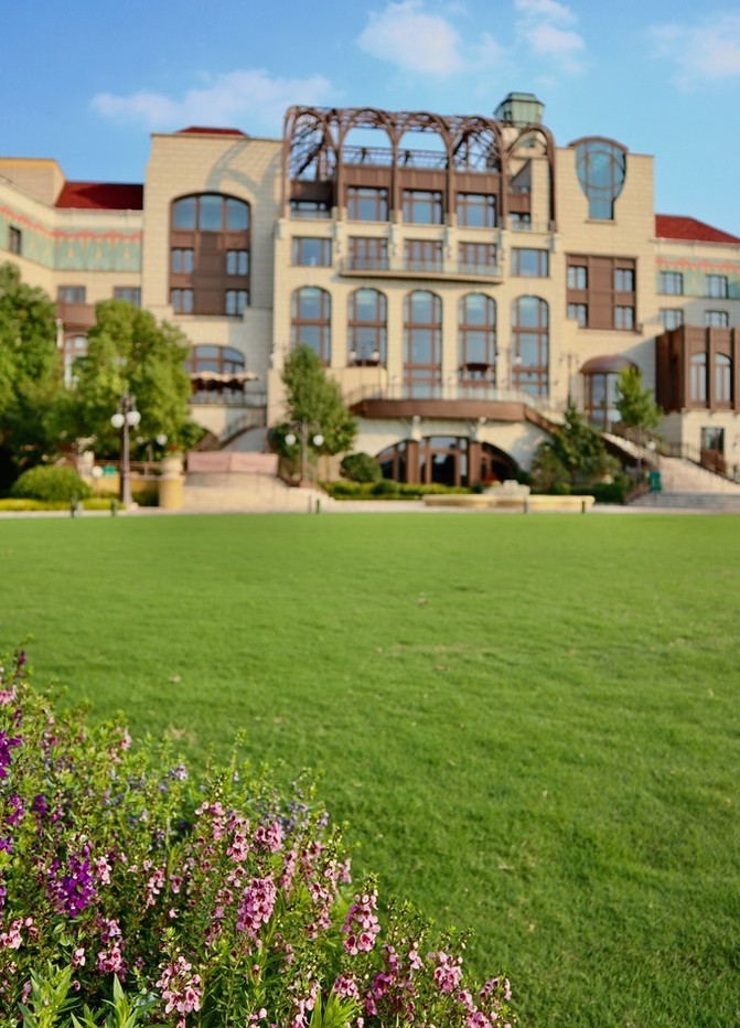 酒店室外还有大大的花园,就像走进了城堡的花园一样,也是非常对称,给人一丝不苟的精致感。
