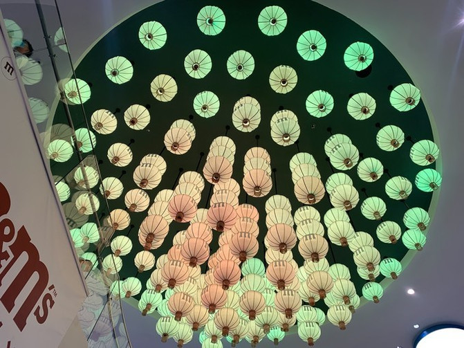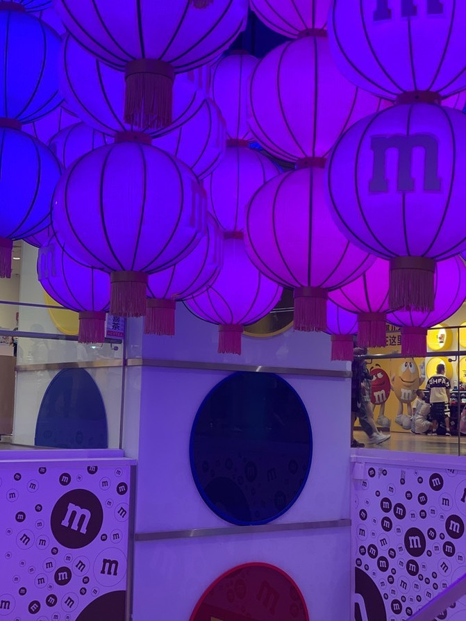 在二层另一面的灯笼花园由无数悬挂的灯笼组成,只需走上前与触摸屏进行简单互动,这些灯笼就会变成与您的个性最相符的M豆颜色。