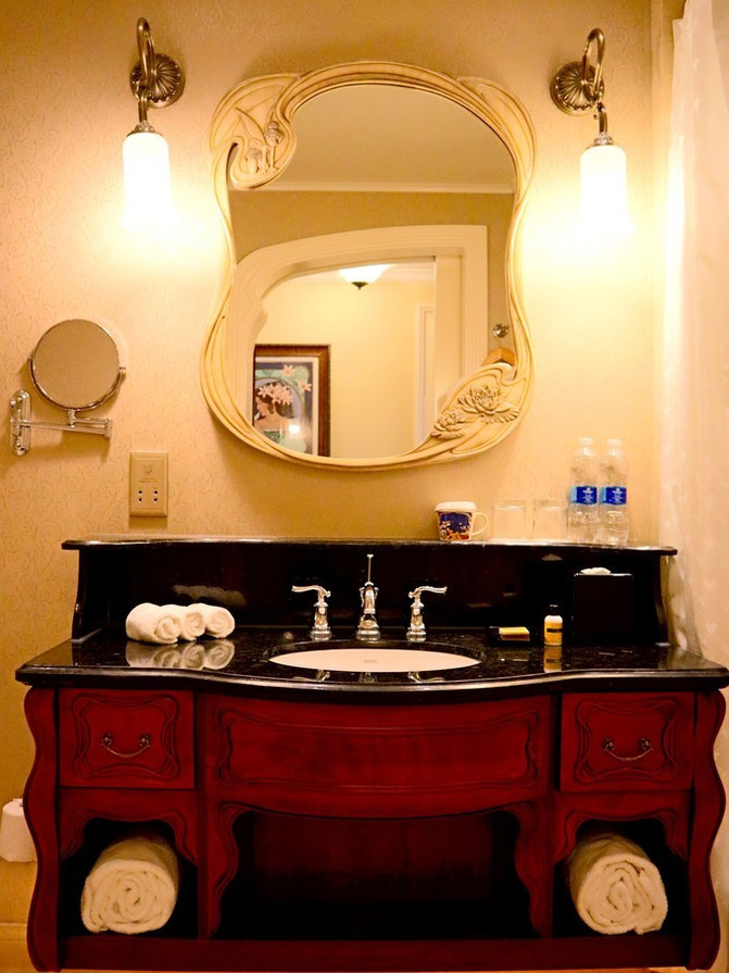 房间里我觉得是有浓郁的美式风情,不算时尚现代类的装潢,更多偏向于古堡系列的复古装修。