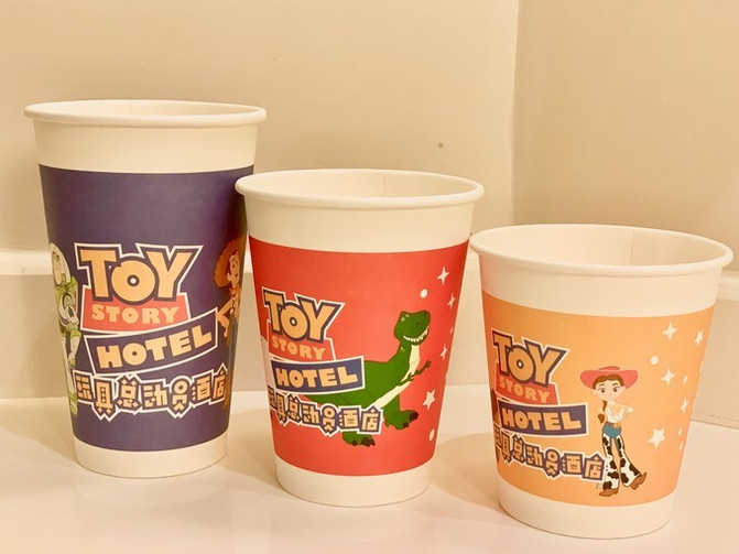 房间里的杯子也都是粑粑-麻麻-娃儿的亲子大小设计,包括提供迪士尼人物主题的房卡、洗漱用品、明信片和文具。