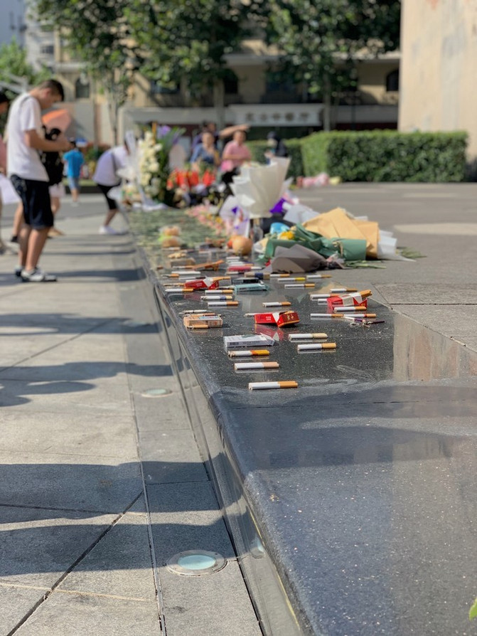 前来参观的市民在这面千疮百孔的墙前为这次战斗中牺牲的壮士们送上自己的一点祭念。