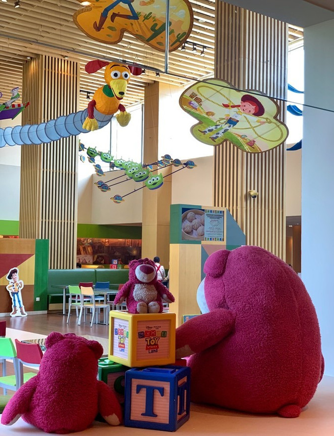 负一楼的阳光食汇吃饭,头顶上飘扬着以玩具总动员动画明星为主题的中式风筝。这些风筝的灵感源于中国著名风筝之乡——山东潍坊的传统风筝制作工艺。