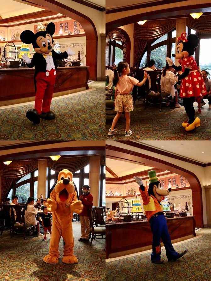 到这里吃自助餐,主要是为了见到卡通明星朋友们。他们每隔半个小时会循环来到用餐区跟客人们打招呼,跳舞,合影留念,用餐时间规定是75分钟,我反正足足见了她们四次,分别是米奇,米妮,高飞和布鲁托。