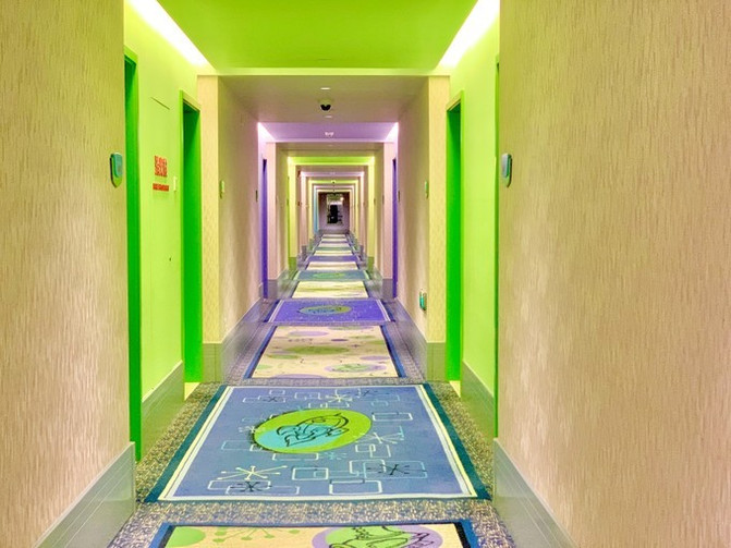 整个酒店色泽丰富,就像掉进了糖果屋一样,都是可爱的七彩糖果色彩,所有的长廊柱子就像是玩具拼接在一起的感觉,很可爱。